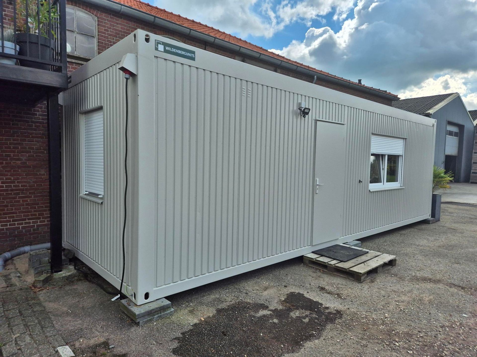 - Aansluiting op water, riool, elektra (380V 32A) en internet (aansluiting aanwezig) is voor eigen rekening.