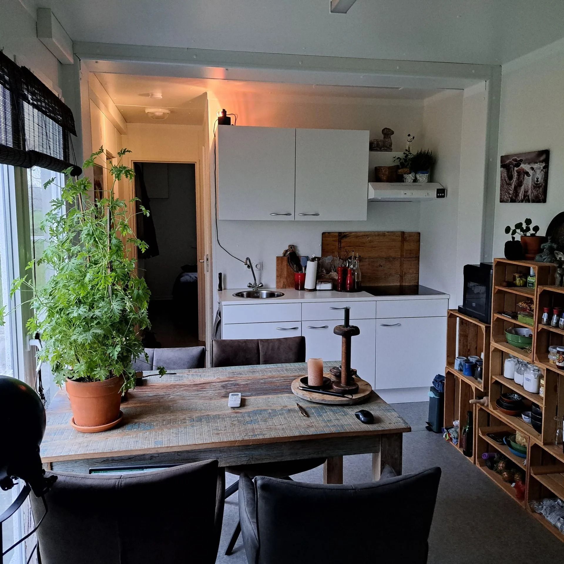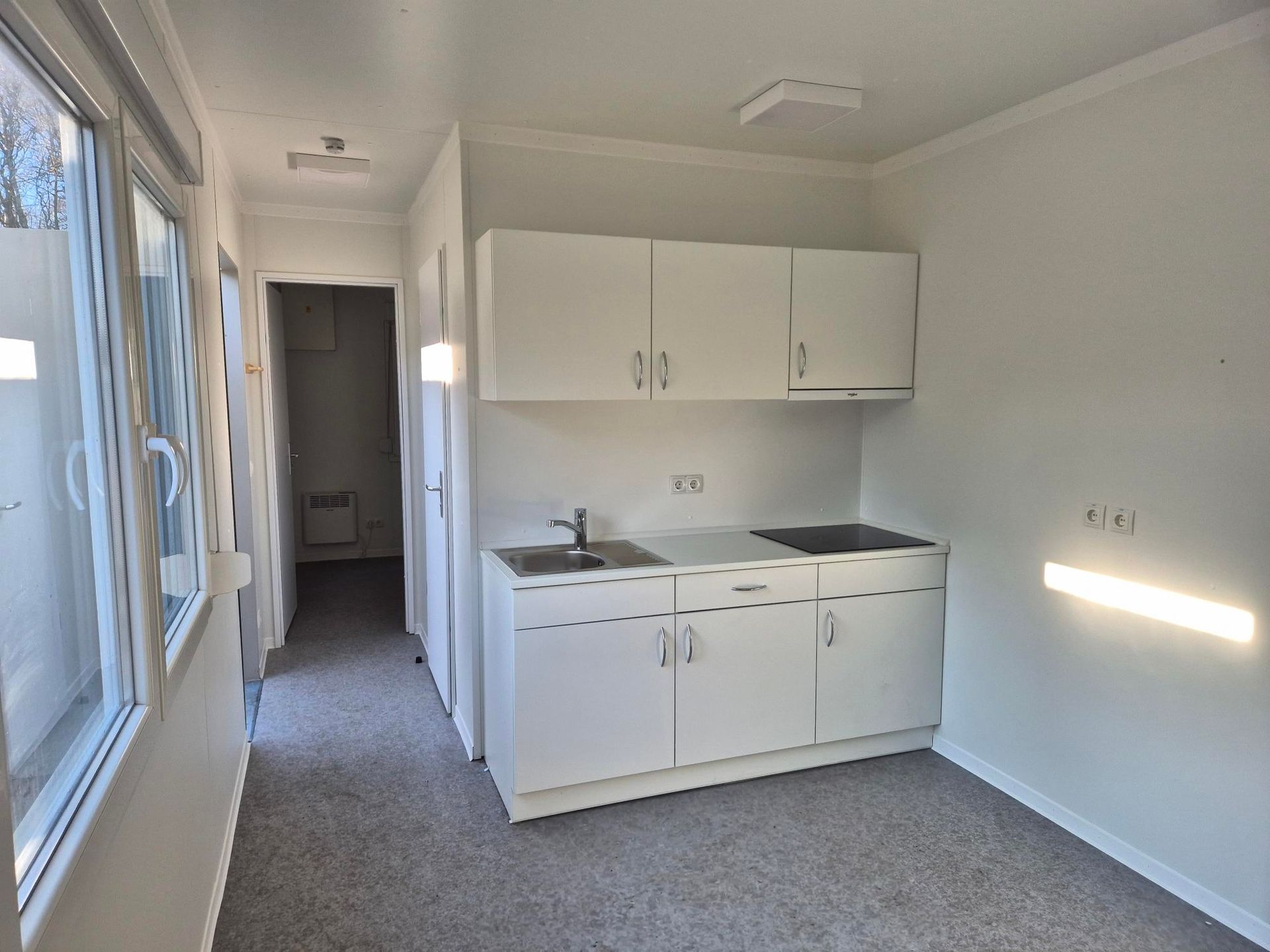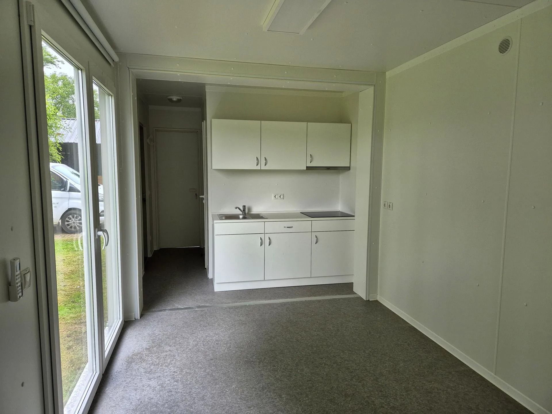 - Ruime woonkamer/keuken: de keuken is voorzien van een inductiekookplaat, spoelbak en aansluitingen voor het plaatsen van een koelkast/vriezer en oven/magnetron.