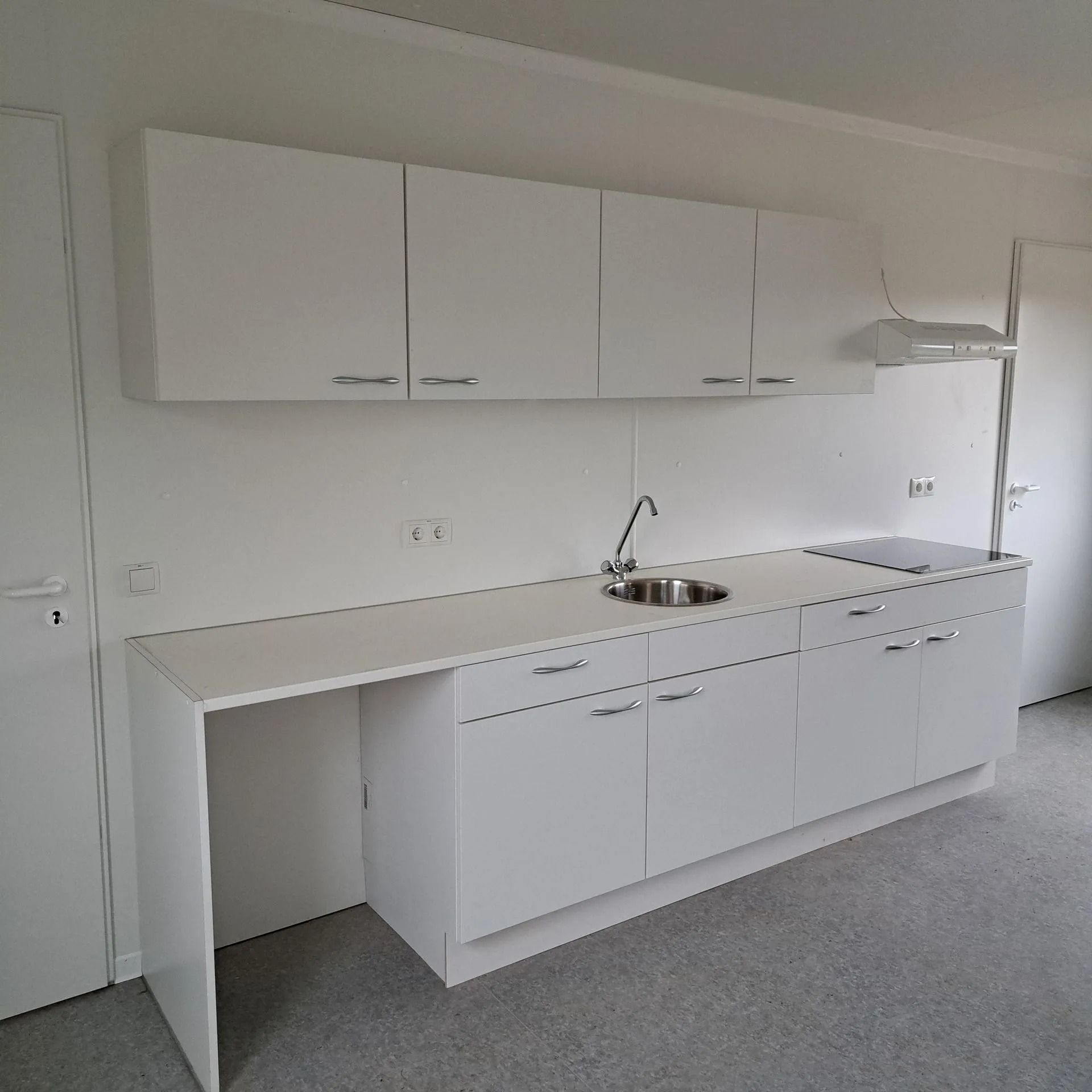 - Hele ruime woonkamer/keuken: de keuken is voorzien van een inductiekookplaat, afzuigkap, spoelbak en aansluitingen voor het plaatsen van een koelkast/vriezer, oven/magnetron en vaatwasser.